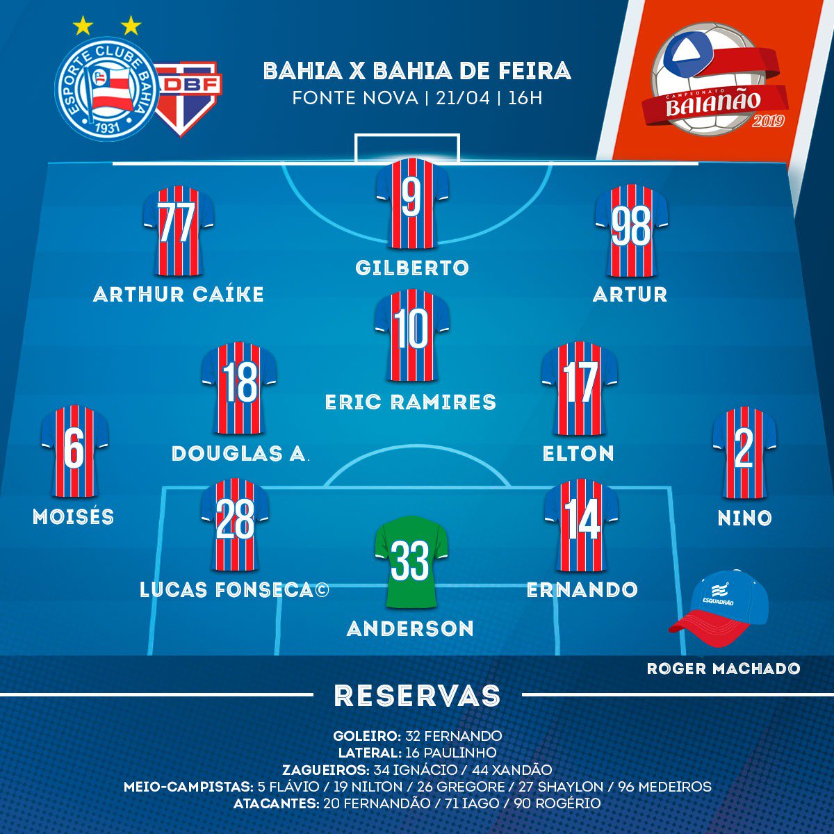 Está tudo pronto para o Bahia entrar em campo às 16h deste domingo (21), na Arena Fonte Nova, para decidir o título de campeão baiano com o Bahia de Feira.