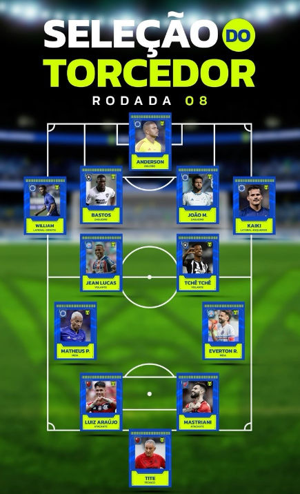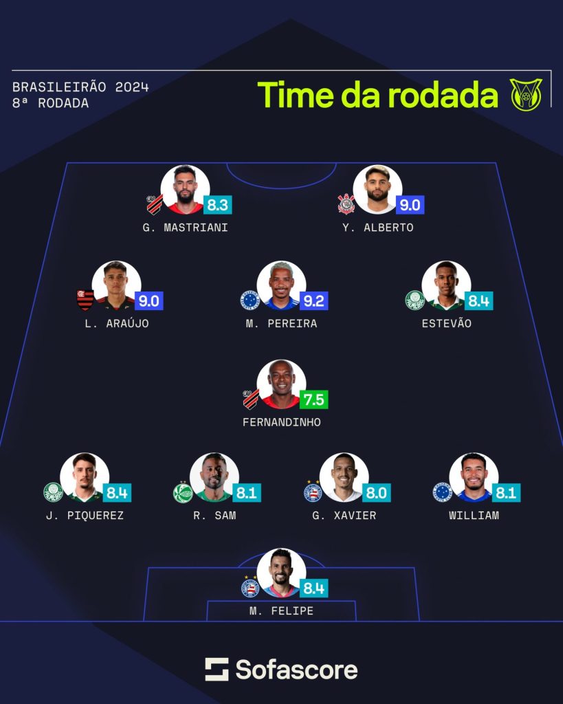 Já na votação popular aberta ao fim de cada rodada no perfil @Brasileirao, na rede social X, foram dois jogadores de meio-campo do Bahia.