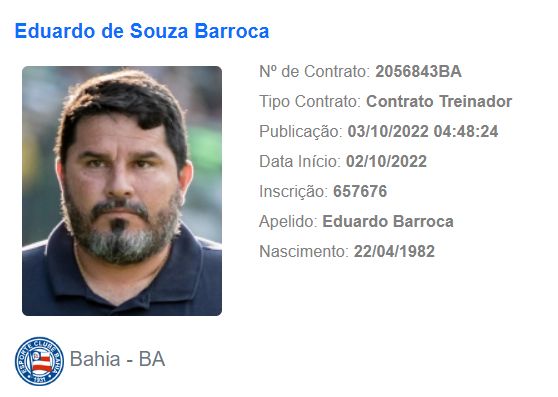 Treinador de 40 anos, Barroca assinou contrato com o Bahia até o fim desta temporada de 2022.
