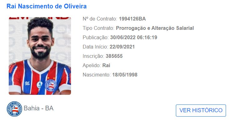 O novo contrato assinado pelo jogador já foi registrado no BID, da CBF, deixando-o apto para defender a camisa do Bahia na partida contra o Grêmio, pela 16ª rodada do Brasileirão Série B.