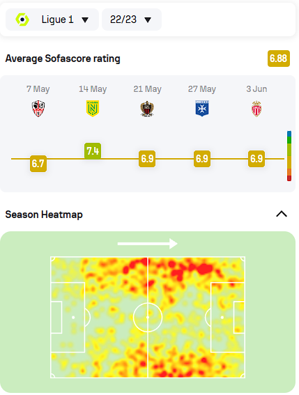 Abaixo, o mapa de calor de Rafael Ratão entre agosto de 2022 e maio de 2023, também no SofaScore.