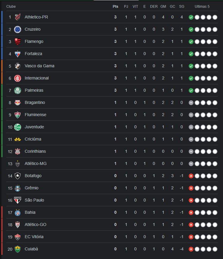 Veja a classificação após a 1ª rodada:
