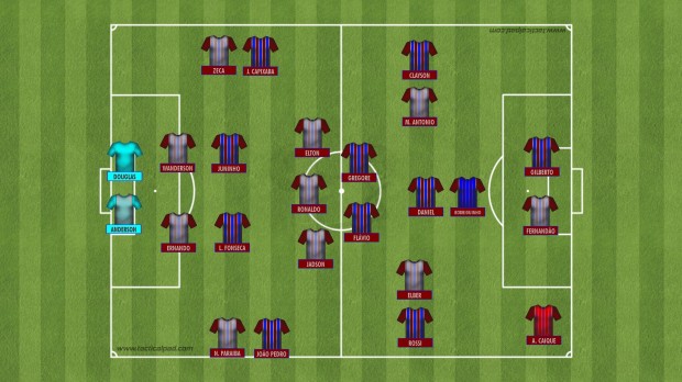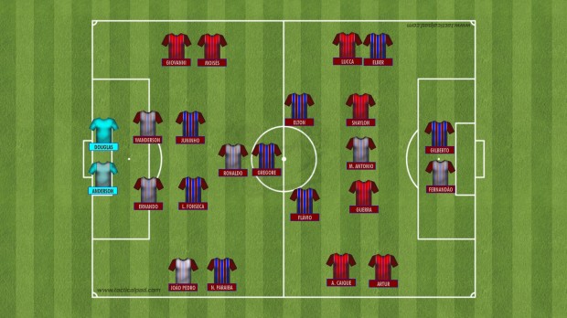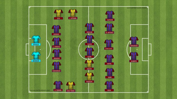 Novamente, sem coletes os titulares na maioria dos jogos, com coletes brancos os reservas e de coletes vermelhos os que deixarão o time esse ano em algum momento (destes, apenas Moisés e Artur eram considerados titulares).