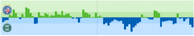 O fato é que, no primeiro tempo, vi um time que conseguiu aliar algum volume de jogo (posse de 48% no primeiro tempo e 9 finalizações, sendo 5 dentro da área adversária), com transições rápidas (o lance do pênalti e uma chance clara perdida por Élber, após enfiada de Capixaba, ilustram lances assim). Vale destacar que o Coritiba, apesar de limitado, é um time que gosta de um jogo de posse, característica de seu jovem treinador desde seu trabalho no Botafogo. Então, esse equilíbrio na posse com um time com esse perfil de jogo é um dado interessante.