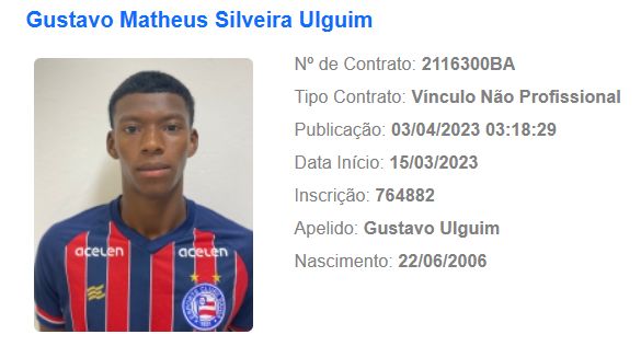 Jogador da geração 2006, Gustavo se junta inicialmente ao elenco sub-17 do Esquadrão, e já fez sua estreia no Campeonato Baiano sub-20 nessa última quinta-feira (6), entrando no segundo tempo do triunfo diante da Juazeirense com a equipe alternativa júnior.