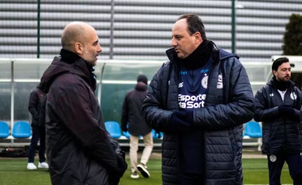 O dia é de entrevistas dos comandantes no CT do Manchester City. Na véspera de mais uma rodada da Premier League, o técnico do clube inglês, Pep Guardiola, falou com a imprensa antes da coletiva do treinador Rogério Ceni.