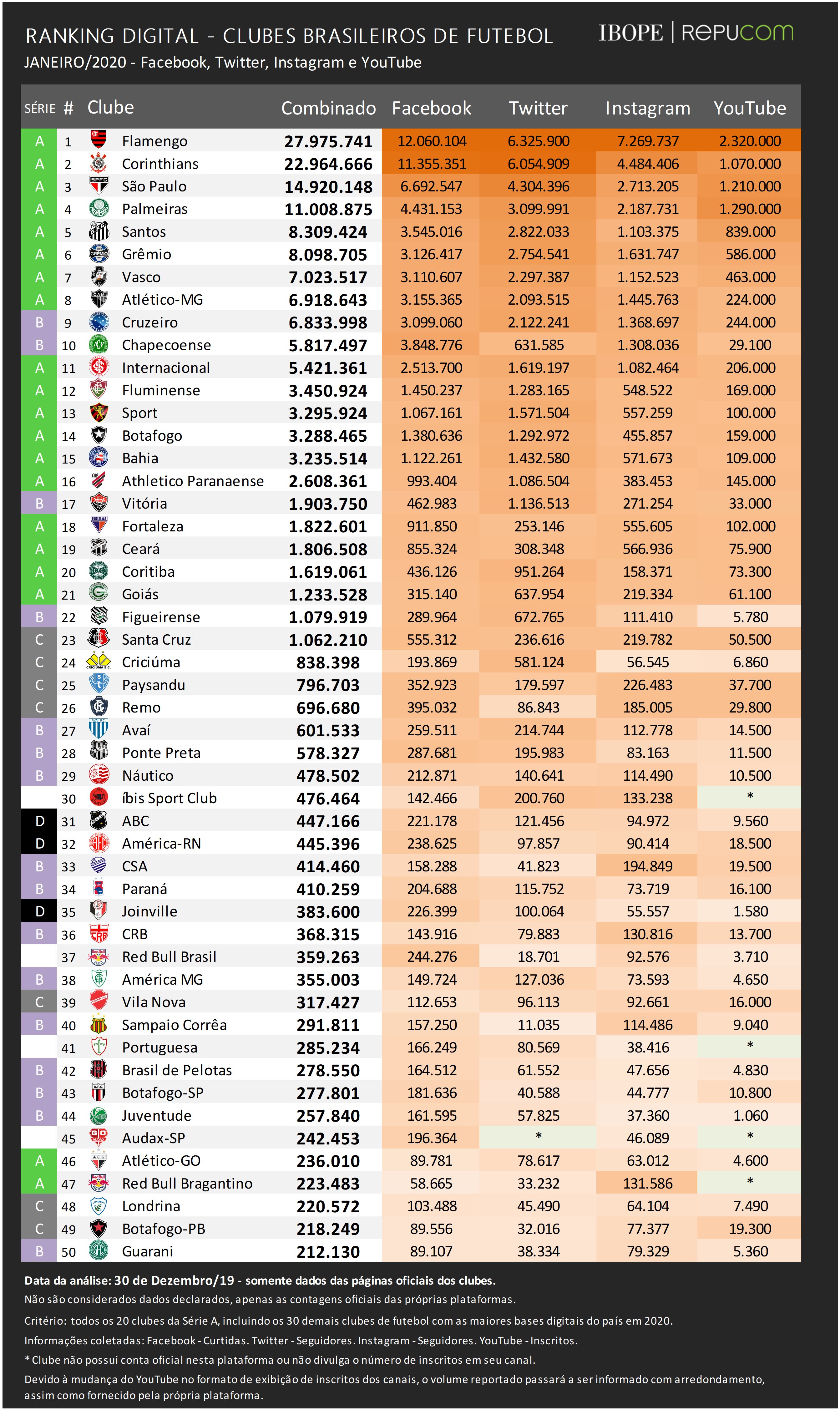 Feito mensalmente pelo Ibope Repucom, o ranking contabiliza dados do mês de dezembro e aponta o Bahia com 3.235,514 milhões de seguidores nas páginas oficiais do clube no Facebook, Twitter, Instagram e Youtube.