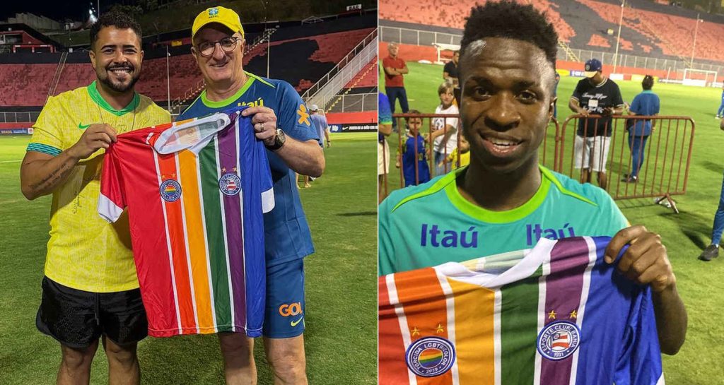 Vinícius Jr. e Dorival recebem camisa da torcida LGBTricolor em ação da CBF